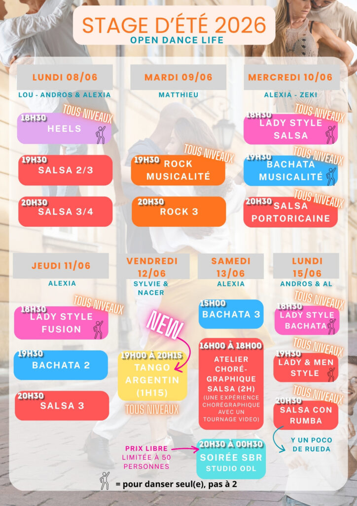 Que vous soyez de niveau débutant, intermédiaire ou avancé, retrouvez nous plusieurs soirs par semaine dans notre studio de danse : zone Rousset/Peynier pour des cours de Salsa cubaine couple et solo ainsi que Lady style, Heels, Bachata et Rock dispensés par Zeki, Laetitia, Lauris, Lou, Andros ainsi qu’Alexia : gérante et directrice artistique de l’association Open Dance Life. Enseignante diplômée par la Fédération Française de danse (FFD).