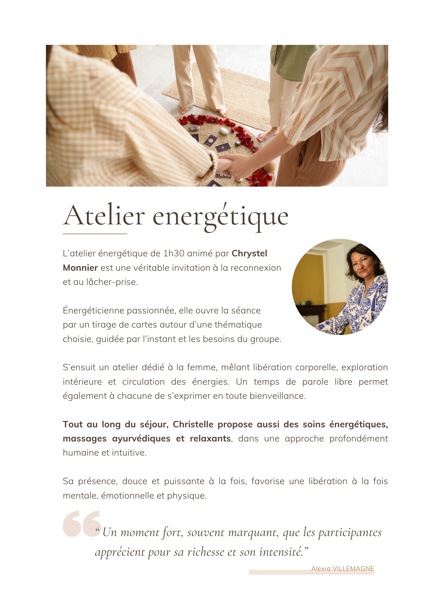 Avec l’intervention de Chrystel Monnier, tu plongeras dans une autre dimension : celle de l’énergétique, de l’intuition et du féminin sacré.