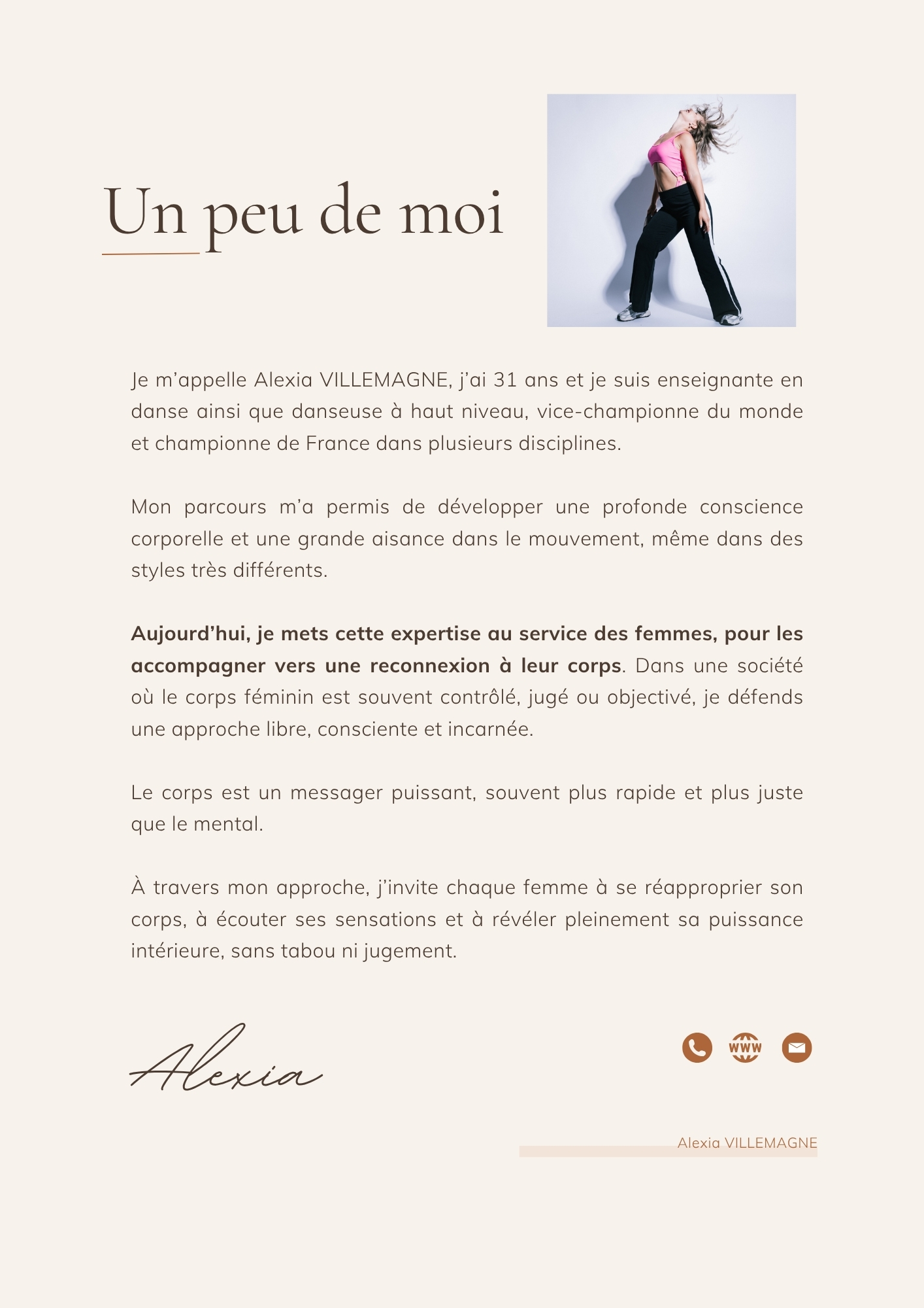 Guidé par Alexia VILLEMAGNE, danseuse de haut niveau, enseignante diplômée de la Fédération Française de Danse et